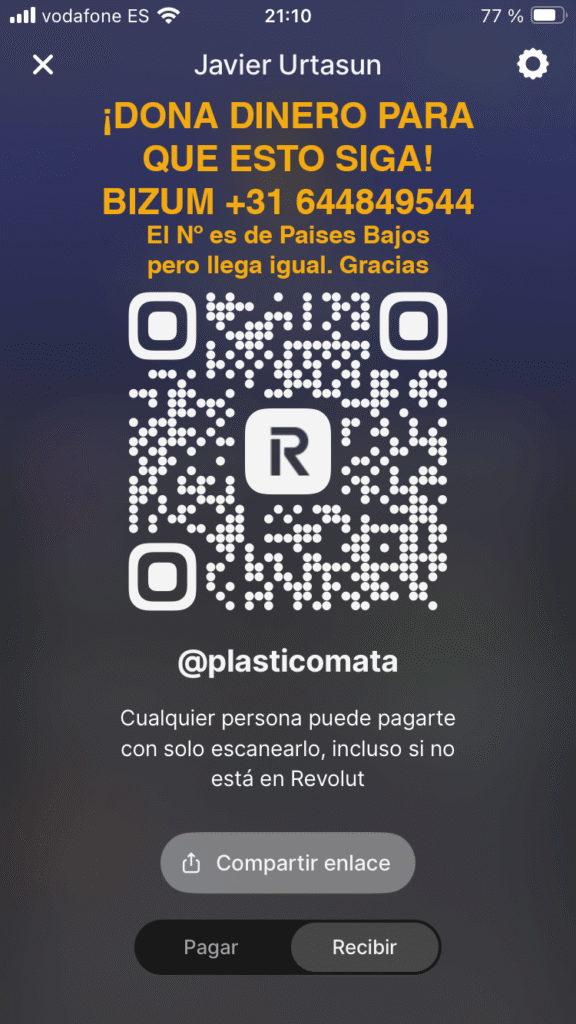 SI OS APETECE PODEÍS HACER DONACIONES PARA MI SUBSISTENCIA, AL MENOS PARA QUE COMPRE DISCOS DUROS PARA GUARDAR LOS VIDEOS QUE SUBO (MÁS ABAJO EL ENLACE A TODOS LOS VIDEOS). PODEIS DONAR LO QUE QUERAÍS, NO ACEPTO, Y VA EN SERIO, GRANDES DONATIVOS DE MÁS DE 1.000 EUROS POR SI HUBIESE PROBLEMAS LEGALES. 5 EUROS ESTÁ BIEN. CON PONER ESTE CODIGO QR DELANTE DE TU CAMARA DEL MOVIL PUEDES DONAR. ES SENCILLO Y VA A MI CUENTA DE REVOLUT. UN BANCO GRATUITO QUE ESTÁ EN LITUANIA PERO TIENE IBAN ESPAÑOL Y RIGE TODO SEGUN LA UNION EUROPEA. NO OS ROBAN NI A VOSOTROS NI A MI. TAMBIÉN TENGO BIZUM. ESTÁ CONECTADO A MI NÚMERO DE TELEFONO DE PAISES BAJOS +31 644 84 95 44. NO OS PREOCUPEIS QUE ME LLEGA LA PASTA Y SALE MI NOMBRE JAVIER URTASUN. SI NO PONE JAVIER URTASUN TAL VEZ PONGA PETER ALGO. ESTÁ TODO BIEN. ENVIAD SIN MIEDO. ME AYUDARÁ. GRACIAS: